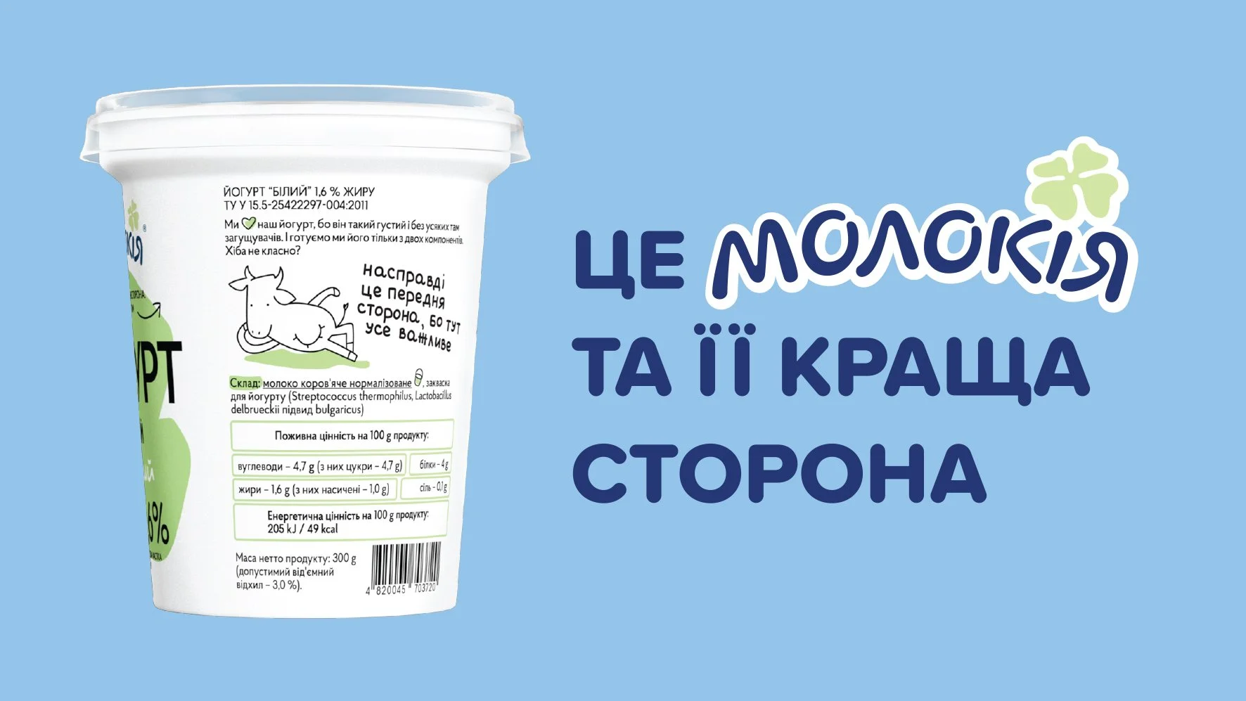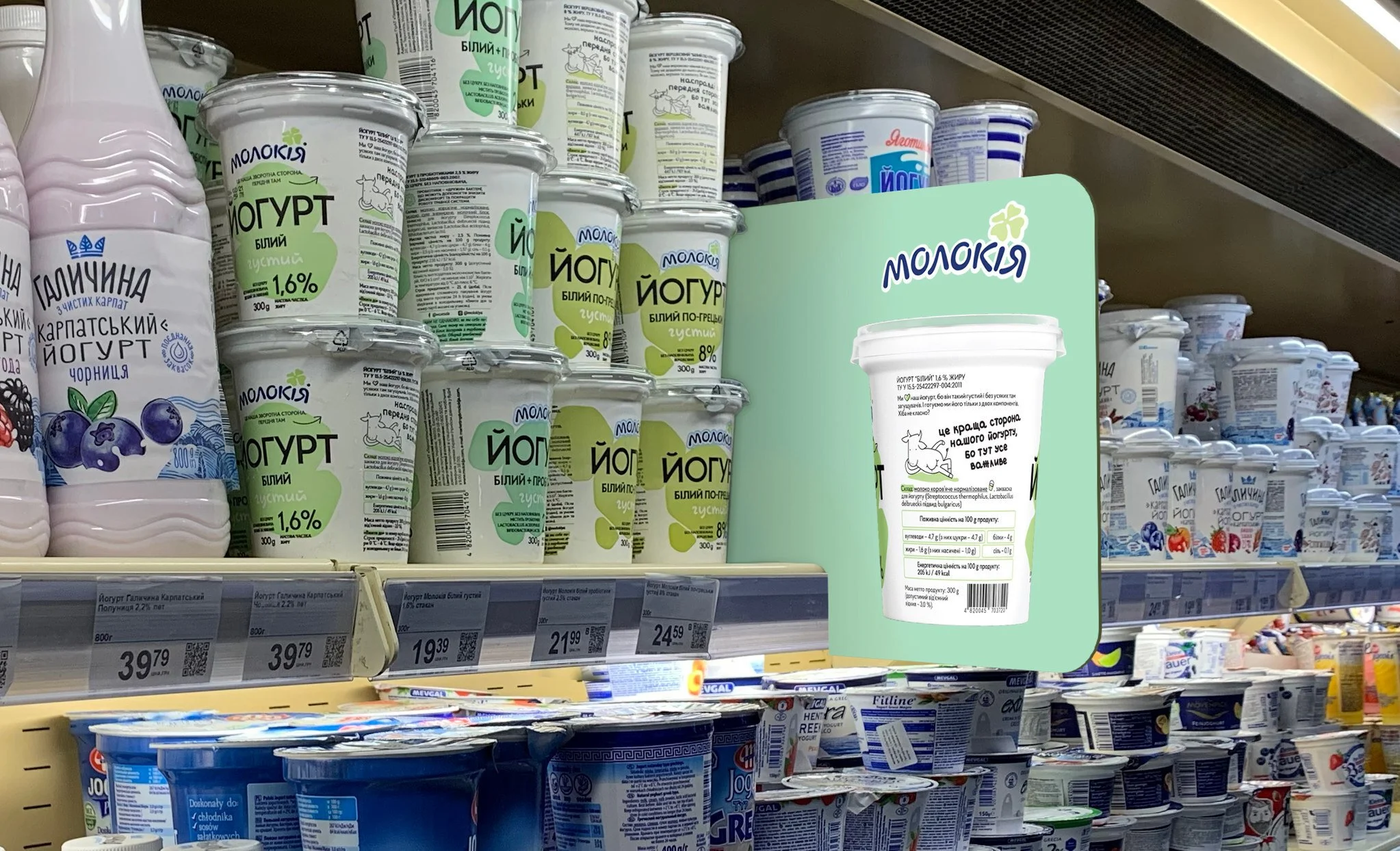 For Ukrainian dairy brand Molokija, the quality of products and ingredients is the most important thing. To tell about this we made the side with ingredients their main side, and turned their products around in all ads.